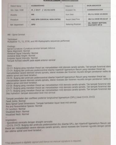 Saat ini keluhan terberat yang ia rasakan adalah lengan sangat lemah dan tidak bisa mengangkat walaupun tanpa beban. Dan ini harus segera dilakukan tindakan operasi dan menjalani fisioterapi agar penyakit ini tidak semakin parah. Jika tidak mendapatkan tindakan tersebut dalam waktu dekat bisa berakibat pada kelumpuhan.